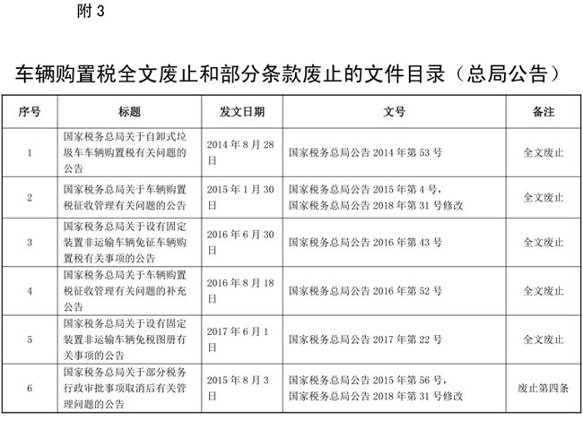 為落實《中華人民共和國車輛購置稅法》(以下簡稱《車購稅法》),規范車輛購置稅征收管理,現就有關事項公告如下: 一、車輛購置稅實行一車一申報制度。 二、《車購稅法》第六條第四項所稱的購置應稅車輛時相關憑證,是指原車輛所有人購置或者以其他方式取得應稅車輛時載明價格的憑證。無法提供相關憑證的,參照同類應稅車輛市場平均交易價格確定其計稅價格。無同類應稅車輛市場平均交易價格的,由稅務機關依據《中華人民共和國稅收征收管理法》(以下簡稱《稅收征管法》)及其實施細則核定其應納稅額。 原車輛所有人為車輛生產或者銷售企業,未開具機動車銷售統一發票的,按照車輛生產或者銷售同類應稅車輛的銷售價格確定應稅車輛的計稅價格。無同類應稅車輛銷售價格以及同類應稅車輛無銷售價格的,按照組成計稅價格確定應稅車輛的計稅價格。 三、購置應稅車輛的納稅人,應當到下列地點申報納稅: 。ㄒ唬┬枰k理車輛登記的,向車輛登記地的主管稅務機關申報納稅; (二)不需要辦理車輛登記的,單位納稅人向其機構所在地主管稅務機關申報納稅,個人納稅人向其戶籍所在地或者經常居住地的主管稅務機關申報納稅。 四、《車購稅法》第十二條所稱納稅義務發生時間,按照下列情形確定: 。ㄒ唬┵徺I自用應稅車輛的為購買之日,即車輛相關價格憑證的開具日期; 。ǘ┻M口自用應稅車輛的為進口之日,即《海關進口增值稅專用繳款書》或者其他有效憑證的開具日期; 。ㄈ┳援a、受贈、獲獎或者以其他方式取得并自用應稅車輛的為取得之日,即合同、法律文書或者其他有效憑證的生效或者開具日期。 五、納稅人辦理納稅申報時應當如實填報《車輛購置稅納稅申報表》(附件一,以下簡稱《納稅申報表》),同時提供車輛合格證明和車輛相關價格憑證。 六、納稅人在辦理車輛購置稅免稅、減稅時,除按本公告第五條規定提供資料外,還應當根據不同的免減稅項目,分別提供以下資料的原件或者復印件: 。ㄒ唬┩鈬v華使館、領事館和國際組織駐華機構及其有關人員自用車輛,提供機構證明和外交部門出具的身份證明。 。ǘ┏鞘泄黄髽I購置的公共汽電車輛,提供所在地縣級以上(含縣級)交通運輸主管部門出具的公共汽電車輛認定表。 。ㄈ⿷覓鞈本仍畬S锰柵频膰揖C合性消防救援車輛,提供中華人民共和國應急管理部批準的相關文件。 。ㄋ模┗貒⻊盏脑谕饬魧W人員購買的自用國產小汽車,提供海關核發的《中華人民共和國海關回國人員購買國產汽車準購單》。 。ㄎ澹╅L期來華定居專家進口自用小汽車,提供國家外國專家局或者其授權單位核發的專家證或者A類和B類《外國人工作許可證》。 七、免稅、減稅車輛因轉讓、改變用途等原因不再屬于免稅、減稅范圍的,納稅人在辦理納稅申報時,應當如實填報《納稅申報表》。發生二手車交易行為的,提供二手車銷售統一發票;屬于其他情形的,按照相關規定提供申報材料。 八、已經繳納車輛購置稅的,納稅人向原征收機關申請退稅時,應當如實填報《車輛購置稅退稅申請表》(附件二,以下簡稱《退稅申請表》),除提供納稅人身份證明外,還應當按照下列情況分別提供以下資料: (一)車輛退回生產企業或者銷售企業的,提供生產企業或者銷售企業開具的退車證明和退車發票。 。ǘ┢渌罁煞ㄒ幰幎☉斖硕惖,根據具體情形提供相關資料。 九、納稅人應如實申報應稅車輛的計稅價格。 納稅人沒有編造虛假計稅依據的,稅務機關按照其申報的計稅價格征收稅款;納稅人編造虛假計稅依據的,稅務機關依照《稅收征管法》及其實施細則的相關規定處理。 十、稅務機關追繳稅款時,納稅人無法按照規定提供申報資料的,可以依據司法、審計、財政等有關機關的文書,為其辦理補稅手續。 十一、本公告要求納稅人提供的資料,稅務機關能夠通過政府信息共享等手段獲取相關資料信息的,納稅人不再提交。 十二、本公告所稱的納稅人身份證明:單位納稅人為《統一社會信用代碼證書》或者營業執照或者其他有效機構證明,個人納稅人為居民身份證或者居民戶口簿或者入境的身份證件。 本公告所稱車輛合格證明為整車出廠合格證或者車輛電子信息單。 本公告所稱車輛相關價格憑證,境內購置車輛為機動車銷售統一發票或者其他有效憑證,進口自用車輛為《海關進口關稅專用繳款書》或者海關進出口貨物征免稅證明。屬于應征消費稅車輛的還包括《海關進口消費稅專用繳款書》。 十三、稅務機關應當在稅款足額入庫或者辦理免稅手續后,將應稅車輛完稅或者免稅電子信息,及時傳送給公安機關交通管理部門。 上款所指稅款足額入庫的情形包括:納稅人到銀行辦理車輛購置稅稅款繳納(轉賬或者現金)由銀行將稅款繳入國庫的,國庫已傳回《稅收繳款書(銀行經收專用)》聯次;納稅人通過橫向聯網電子繳稅系統等電子方式繳納稅款的,稅款劃繳已成功;納稅人在辦稅服務廳以現金方式繳納稅款的,主管稅務機關已收取稅款。 十四、納稅人名稱、車輛廠牌型號、發動機號、車輛識別號、證件號碼等應稅車輛完稅或者免稅電子信息與原申報資料不一致的,納稅人可以到稅務機關辦理完稅或者免稅電子信息更正,但是不包括以下情形: 。ㄒ唬┸囕v識別代號(車架號)和發動機號同時與原申報資料不一致。 。ǘ┩甓惢蛘