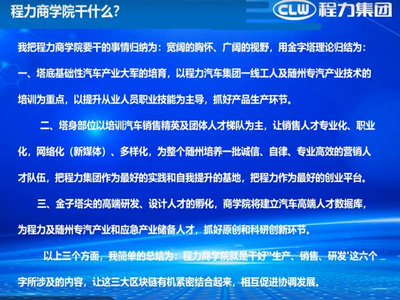 2020年確是一個不同尋常的一年,一場新型冠狀病毒感染的肺炎疫情席卷全國,牽動著億萬國人的心。湖北程力作為中國民營500強企業,公司領導多次為隨州捐款,捐物。為隨州百姓做貢獻。在疫情期間程力商學院組織各專業廠技術專家講師為程力汽車銷售經理提供釘釘在線網上產品業務知識培訓學習。下面是程力汽車集團公司總經理董事長程阿羅在程力商學院開播致辭網路連線圖片: ![]() 總經理在會上闡述: A:什么是程力商學院? 程力汽車集團股份有限公司的主要四大業務矩陣,即:汽車、金融、教育、投資。 這四大產業矩陣中,汽車是涵蓋專用汽車、商用車、新能源汽車、客車、汽車零部件,微卡、輕卡、中卡、重卡、皮卡底盤及整車的研發生產與銷售,以及應急專用汽車的產業全方位產業建設、配套與生產營銷。 金融作為企業發展的血脈,也主要是圍繞著以汽車產業進行匹配和支撐;第三個增長極,就是我們的教育矩陣,這也是為程力的汽車產業,乃至為隨州作為中國專汽之都的大工業,做汽車產業基礎人才培訓和高端研發設計、營銷人才的孵化提升;當然,作為資本的逐利的本質屬性,公司也會對前瞻性、新興高科技產業和國家鼓勵的戰略性支柱產業做適當的投資。 明白了這些思路,我們就可以很好的理解什么是程力商學院了。 簡單的講,程力商學院就是以汽車研發生產銷售為主要內容,進行學習交流的職業教育平臺,它分為線上網絡直播課堂學習及線下實體培訓學習的兩種方式,商學院匯聚了社會各界的專家、教授,智囊、企業家、行業泰斗、營銷精英及政商高端人才,是汽車產業發展的知識寶庫和動力源泉,商學院從2018年籌建上線,至今已2年 B: 程力商學院干什么? 程力商學院要干的事情歸納為:寬闊的胸懷、廣闊的視野,用金字塔理論歸結為: 一、塔底基礎性汽車產業大軍的培育,以程力汽車集團一線工人及隨州專汽產業技術的培訓為重點,以提升從業人員職業技能為主導,抓好產品生產環節。 二、塔身部位以培訓汽車銷售精英及團體人才梯隊為主,讓銷售人才專業化、職業化,網絡化(新媒體)、多樣化,為整個隨州培養一批誠信、自律、專業高效的營銷人才隊伍,把程力集團作為最好的實踐和自我提升的基地,把程力作為最好的創業平臺。 三、金子塔尖的高端研發、設計人才的孵化,商學院將建立汽車高端人才數據庫,為程力及隨州專汽產業和應急產業儲備人才,抓好原創和科研創新環節。 以上三個方面,我簡單的總結為:程力商學院就是干好“生產、銷售、研發'這六個字所涉及的內容,讓這三大區塊鏈有機緊密結合起來,相互促進協調發展。 C程力商學院未來干什么? ![]() 公司總經理程阿羅對商學院的殷切希望 ![]() 程力商學院網上第一期(疫情期間)培訓學習結束語: “沉舟側畔千帆過,病樹前頭萬木春”,走過黑暗我們必將迎來光明;走過黑暗我們必將更加美好!疫情帶給我們暫時的困難,只要我們不忘初心任重道遠堅如磐石,我們一定會更加眾志成城逆勢而上再創佳績。 大家一定要知道,疫情過后,國家一定會加大投資,未來五年,將是創業者最佳的機會,所以現在大家就要加強學習,為隨時迎接經濟繁榮、市場擴大做好準備。 程力一定要為有準備者提供最好的創業平臺,只要你有夢想、無論你是想帶團隊做銷售還是想帶團隊成為專業廠做專業產品,程力的三個廠區都能為你帶來最好的創業環境,或者自己有廠房想加入程力,程力一定為你提供最好的服務團隊,最大的銷售市場,最響亮的品牌,一定幫你實現你的夢想,沒有什么不可實現,只怕你不去一點點學習,在程力找到自己的定位然后再突破。 同志們,我相信有了程力商學院和大家共同進步,大家的夢想都一定能實現。 程力汽車集團2020年3月8日 |