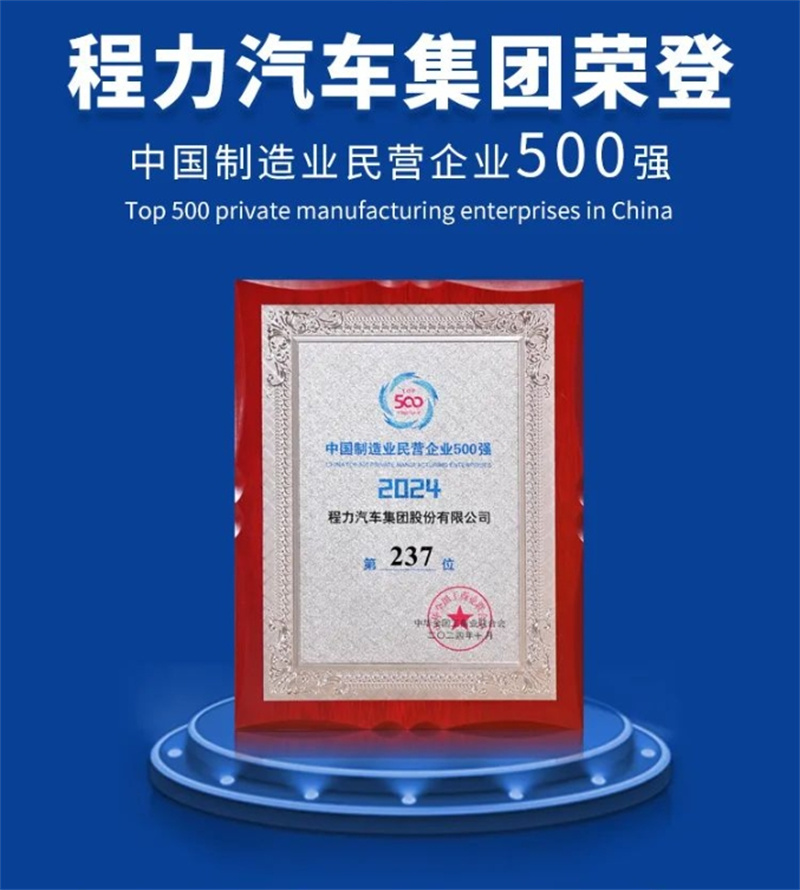 在同期發布的“2024中國制造業民營企業500強”榜單中,程力汽車集團光榮登榜,位列第237位;據悉, 2023年民營企業500強營業收入總額41.91萬億元,戶均838.22億元,較上年增長5.22%;資產總額49.85萬億元,戶均996.94億元,較上年增長7.64%。總體來說,呈現出經營規模穩步增長、總體效益實現提升、產業結構持續優化、創新能力不斷增強、社會責任積極履行等良好態勢。