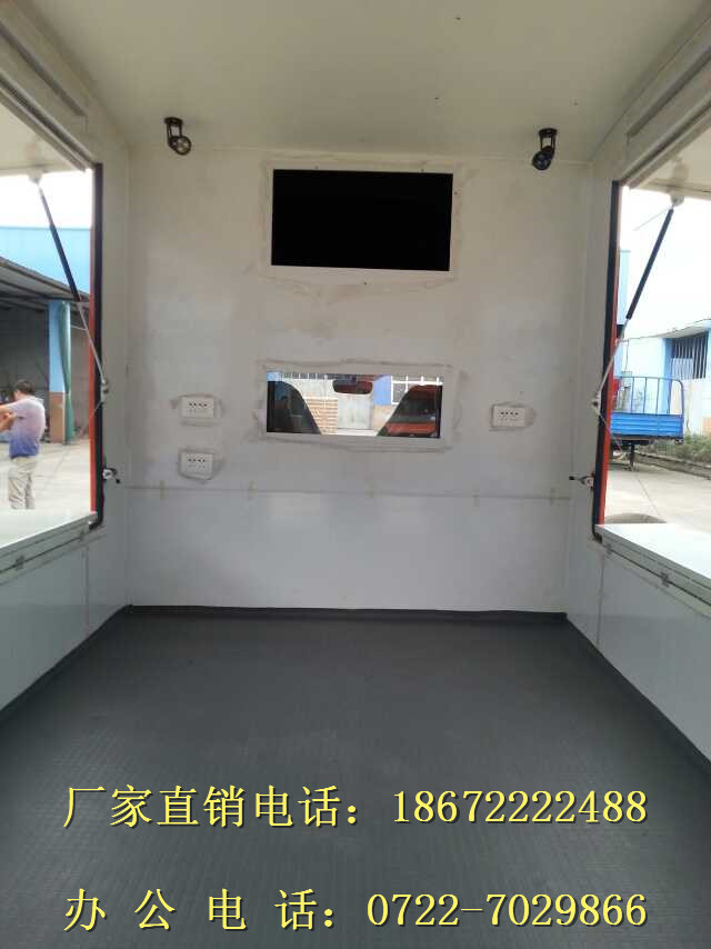 1.車廂頂部封閉選裝通風窗時,高2590mm;選裝頂置空調時,高2890 mm.2左右兩側及后部均可選裝led屏、廣告滾軸燈箱、玻璃窗或上掀門。3.該車前部頂端兩側裝有喇叭,可進行聲音宣傳.4.該車裙邊工具箱艙門可選裝.5.側部和后下部防護裝置為鋼板整體式側圍防護結構,離地高度300mm,側部和后下部防護裝置材料材質為Q235A.發動機型號/最大凈功率(kw)分別為:JL466Q1/46.56;6.可以選裝不同車體顏色和外觀貼畫.