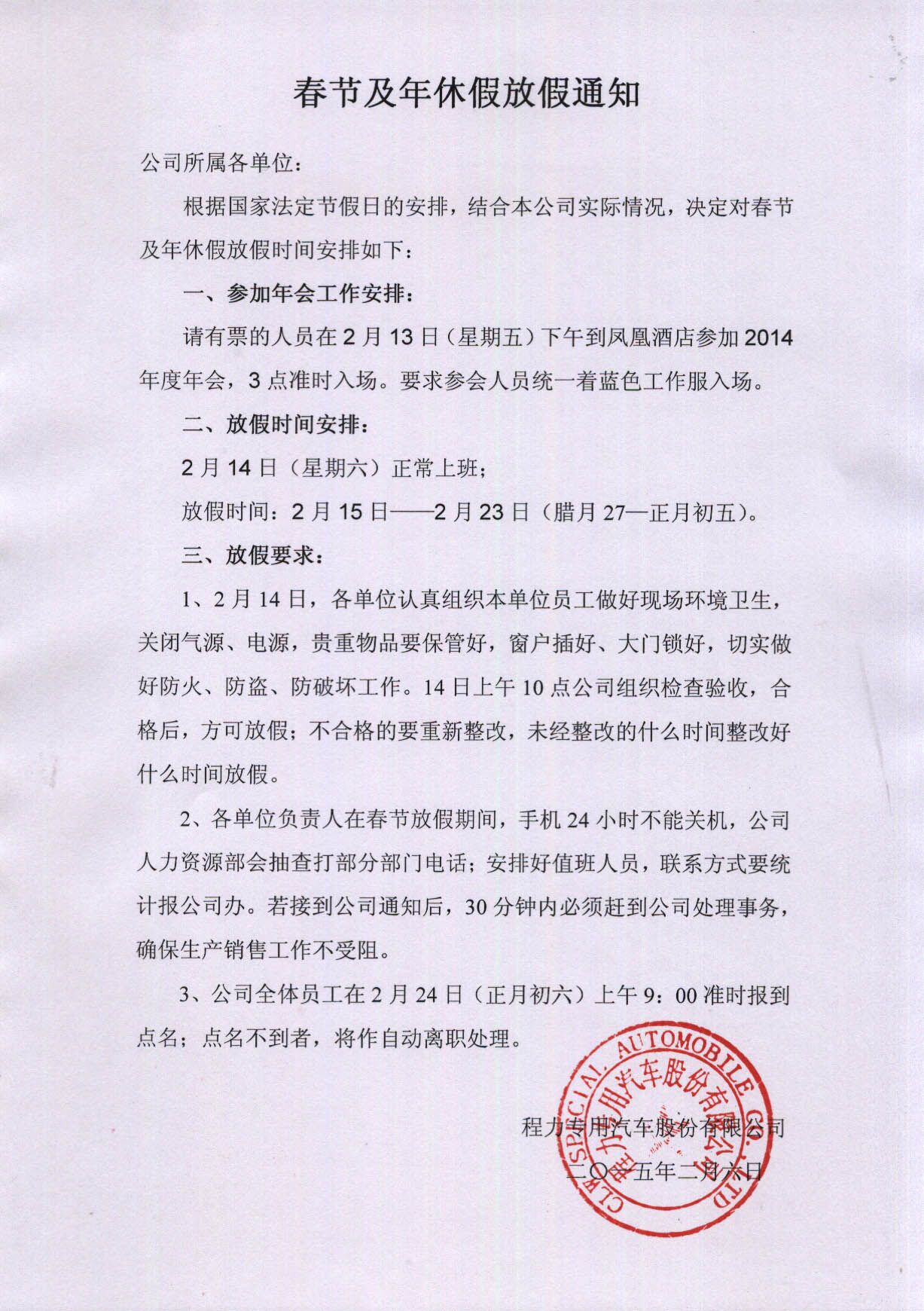 二、公司定于2015年2月15日(臘月27)正式放假,2月24日(正月初六)上午9:00準時報到點名,點名不到者,將作自動離職處理。