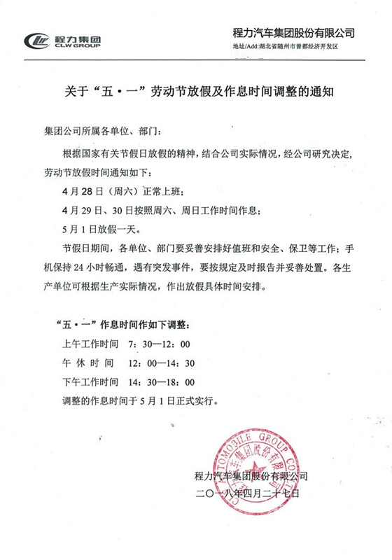 湖北程力汽車集團(tuán)5.1勞動(dòng)節(jié)放假通知