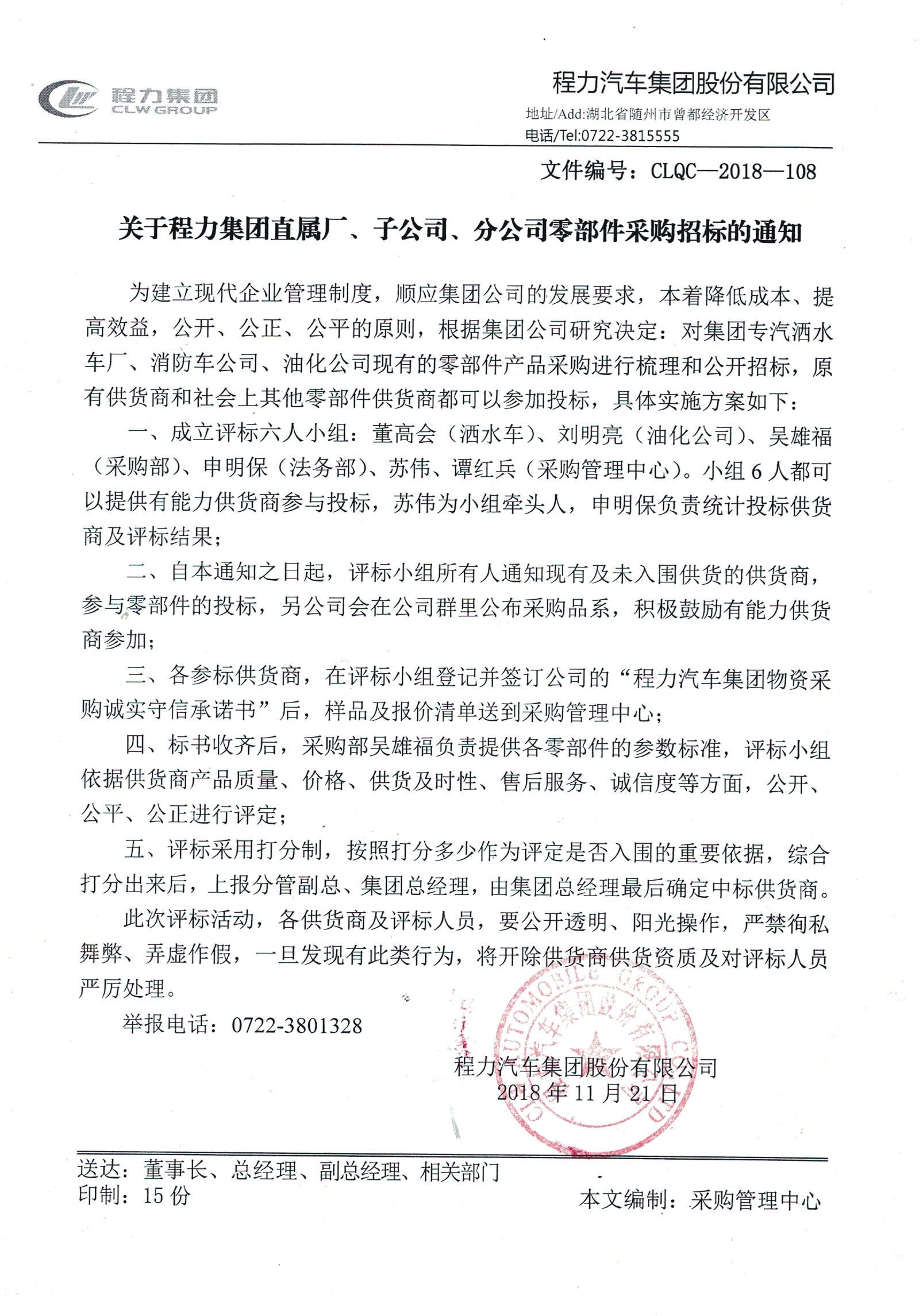 湖北程力汽車所有零部件招投標活動公示