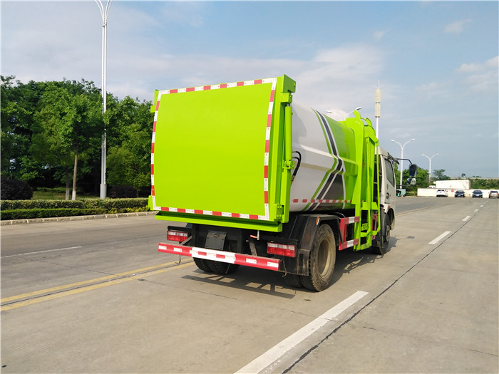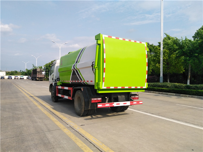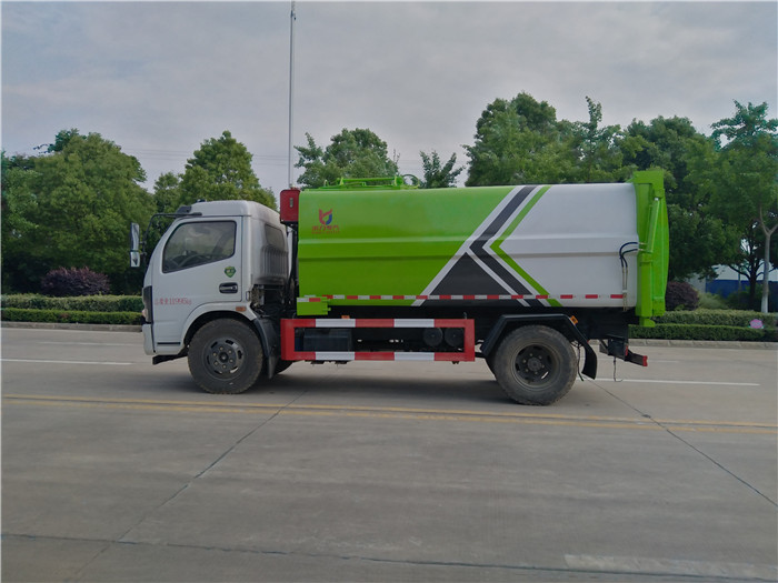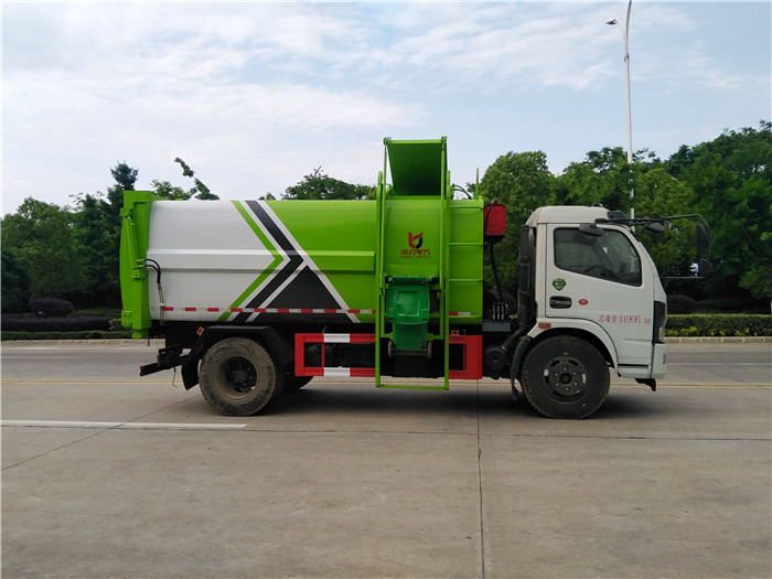 國六東風大多利卡側裝壓縮掛桶自裝卸式垃圾車箱體為圓弧形新型加強型,箱體容積7.5 立方,壓縮方式為液壓底推推板,提升機為機拉桿式,后門液壓反向鎖死,箱體材料為Q345B錳鋼制作,材料厚度為4個厚,液壓閥為中梅或長源牌,液壓缸為海普瑞斯,齒輪泵為合肥長源牌,箱體尾部加裝污水槽,可有效防止垃圾二次污染。