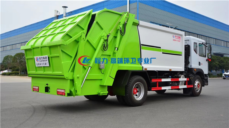 4、智能操作系統采用西門子PLC一鍵循環,駕駛室內與車外均有電控操作盒,后尾部左右各帶一個操作盒。駕駛室室內卸料時操作,外部裝料時操作,另帶有一套手動應急操作,同時設有電子自動油門,不在需要人工加減油門來調節工作速度,一個司機就可以完成全部操作,也可減少或避免野蠻加油而導致液壓系統故障。 湖北程力汽車壓縮垃圾車國六東風D9壓縮垃圾車多方位圖片展示: