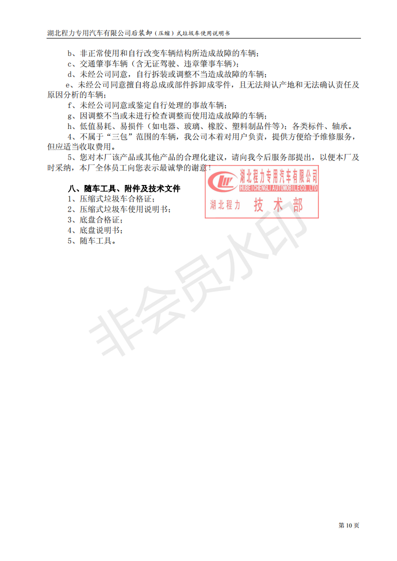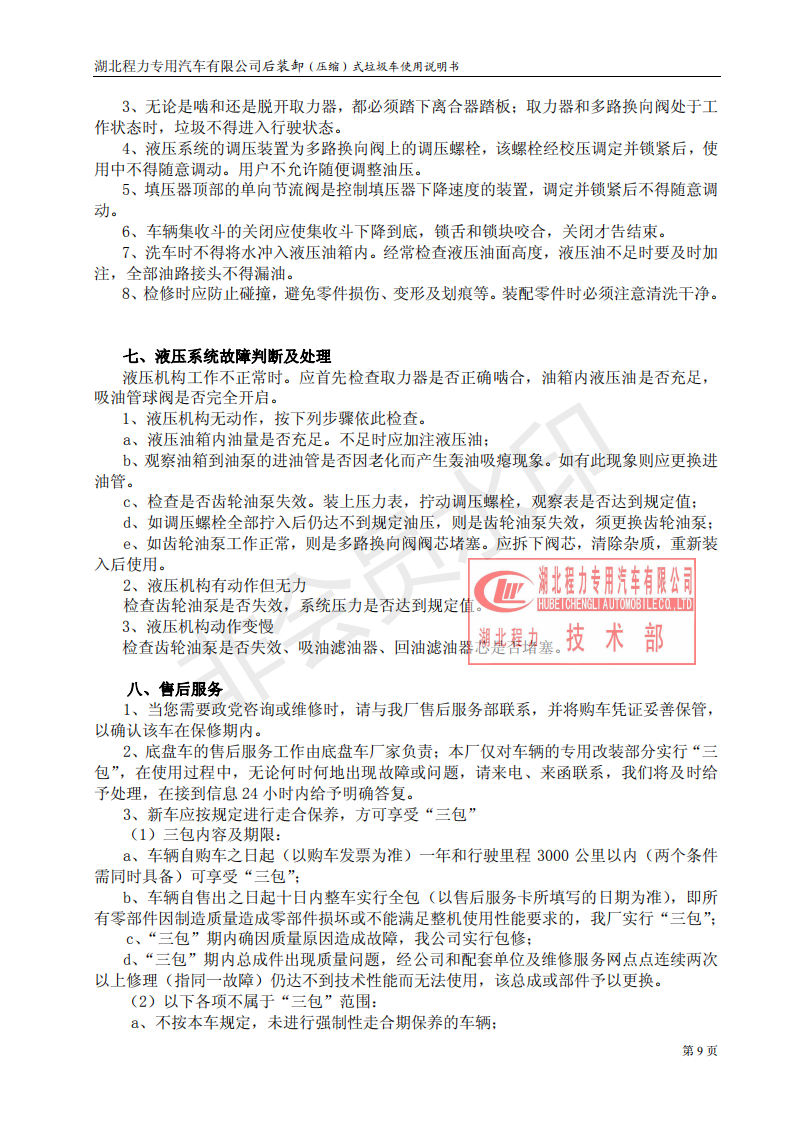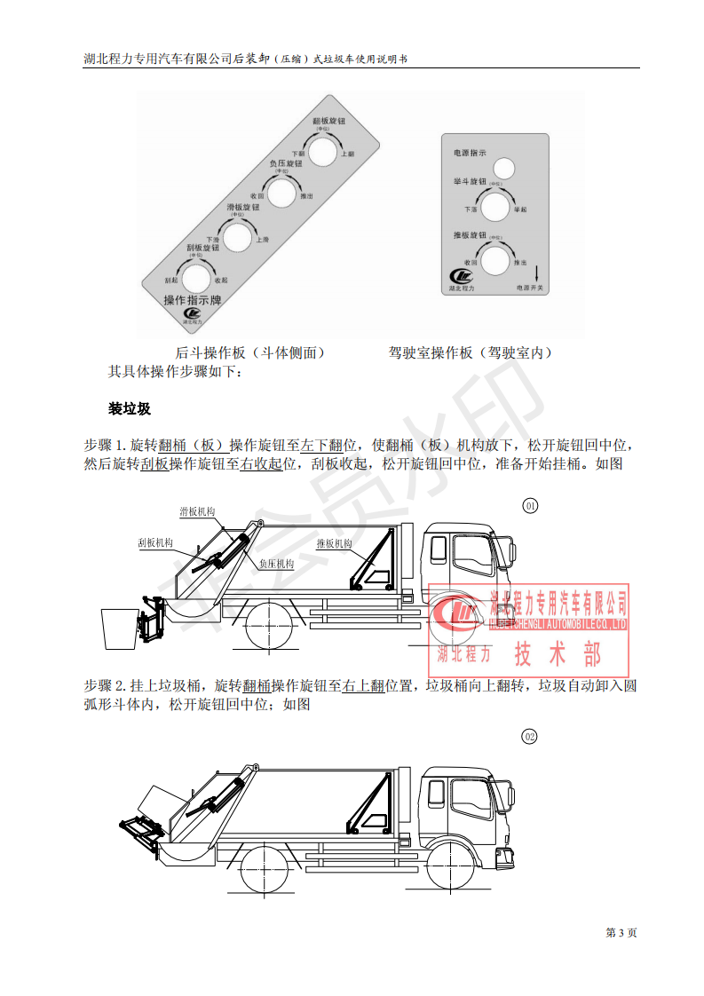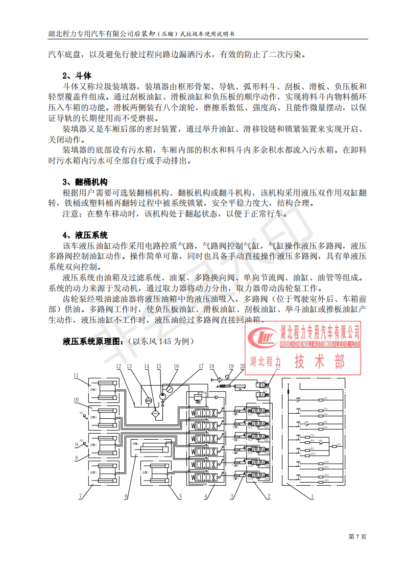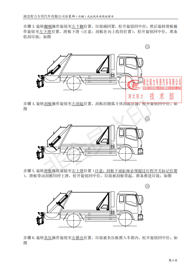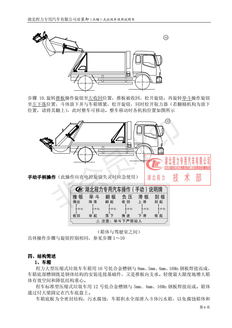 湖北程力壓縮垃圾車由密封式垃圾廂、液壓系統、操作系統組成。壓縮垃圾車整車為全密封型,自行壓縮、自行傾倒、壓縮過程中的污水全部進入污水廂,較為徹底的解決了壓縮車運輸過程中的二次污染的問題,關鍵部件采用進口部件,具有壓力大、密封性好、操作方便、安全等優點。