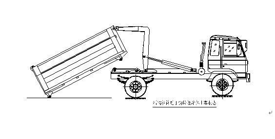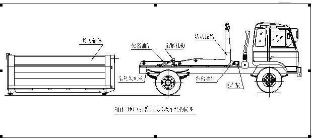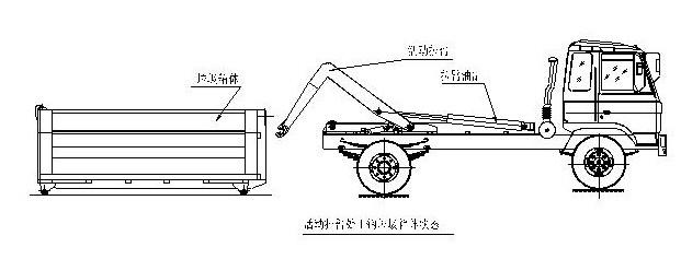 該車是由汽車底盤、拉臂主油缸、附車架、翻轉架、支撐腿(選裝)、鎖緊架、鎖緊油缸及多路換向閥等組成。翻轉架一端連在附車架上,其另一端設有活動拉臂,中間安裝有鎖緊系統;活動臂油缸一端連在活動臂上,另一端連接在附車架上;鎖緊機構通過鎖緊油缸的動作可以在箱體自卸時將附車架上的箱體與翻轉架及拉臂連為一體,在主油缸伸出時形成自卸角,也可以通過鎖緊油缸的收回把翻轉架與附車架鎖緊為一體,利用主油缸的收回或伸出使活動拉臂將地下的垃圾箱拖拉至附車架上或從附車架上放回到地面。