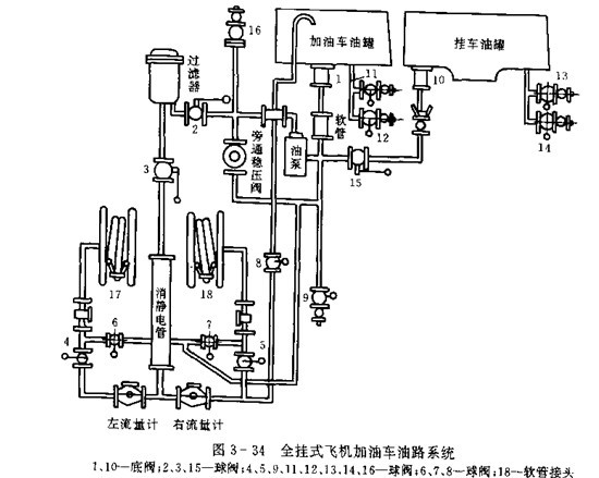 飛機加油車 (1)飛機加油的特殊要求,飛機加油車在總體上與普通加油車基本相同,但結構上還有特殊要求。 ①加油壓力穩定性要求高,為此在加油管路上加裝壓力調節器,穩壓器和壓力加油接冰在。 ②油料的潔凈度高。油路上要用高性能的過濾分離器。罐體和管道必須采用鋁合金制造。 ③絕對保證加油安全性。應安裝消靜電裝置,聯鎖控制系統、電氣防爆器、滅火器等。 ④裝有高精度,大流量的計量器。 ⑤油罐總容量大,給飛機加油要一次完成。 (2)飛機加油車特殊要求的主要部件 ①旁通穩壓閥。給飛機加油,一般采取底部閉式加油,要求加油車具有穩定的管端壓力,通常為0.343MPa,而對車輛加油則不要求管端壓力。一般在油泵上并聯旁穩壓閥,在絞盤后的出油管路上串聯壓力補償器。圖3-34為全掛式飛機加油車油路系統圖,油泵上并聯有旁通穩壓閥,其調定壓力為油泵的工作壓力,由管端壓力和管路的壓力損失確定。圖3-35 為旁通穩壓閥的工作原理圖。氣室1內充有一定壓力的空氣,上部油室2與泵的出口高壓油相通,氣室活塞3、油室活塞4與閥門5連成一體。在泵正常工用壓力下,氣室的氣體對活塞3的推力F1與油室油液對活塞4的推力F2相等,閥門5關閉不動,當泵出口壓力升高時,油室的壓力隨之升高,F2> F1,活塞在力F=F2-F1的作用下推動閥5下移,閥門被打開,泵的出口與入口油路接通,系統壓力被打開,泵的出口與入口油路接通,系統壓力開始下降,直至恢復原工作壓力,閥門又呈關閉狀態。 ②過濾分離器,為了獲得高潔凈度燃油,在管路中需加裝高性能的過濾分離器,將油中的水分,膠質和雜質分離出來,圖3-36為兩級過濾分離器。第一級濾芯2為聚結濾芯,由經過特殊處理的濾紙或玻璃纖維,合成材料,毛氈、棉織品等制成。油流經濾芯時,首先濾出的固體物質,再將膠質分離,同時將分離出的小水粒聚集成大水滴,落入由外殼形成的集水器中,第二級濾芯1為分離器濾芯,表面涂有聚四氟乙烯的表面滑下,滴入集水池中,達到徹底分離水的作用。