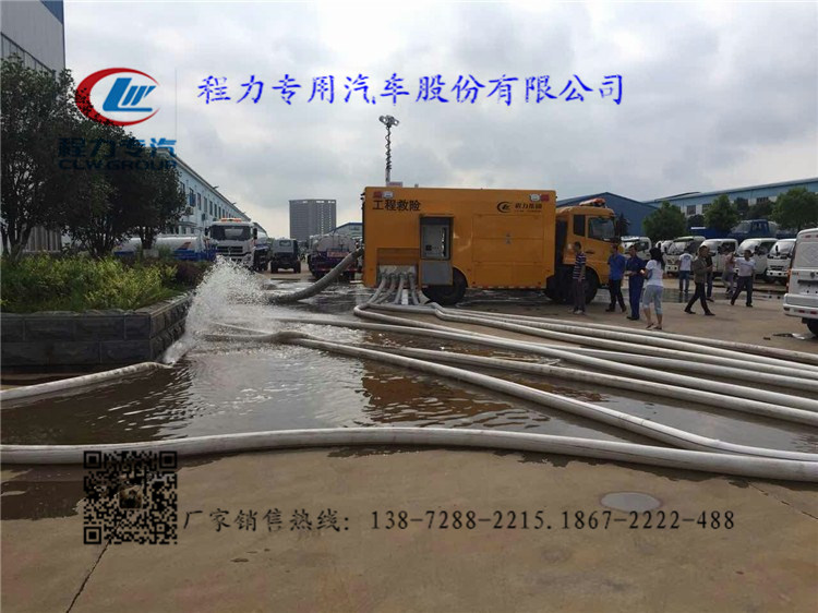選裝配置:選裝行李架、爬梯、車頂工作臺;選裝不同形狀、結構的警示燈;選裝中隔斷(可選擇開門)、車身兩側可選開上掀門、盲窗、側開門;花紋鋁板;加裝設備工具柜、配電箱、發電機組、水泵、電焊機、空壓機等線路安裝外接電源系統、(室內燈光照明、探照燈、高桿照明燈等);繞線盤,還可根據用戶不同需求加裝不同的維修搶險設備、車身制作專用圖案或標識。 東風天錦工程救險車、抗洪救災車,搶險車,抗洪吸水車,抗旱車 程力專用汽車股份有限公司最新研發的搶險救援車,工程搶險車,抗洪吸水車,應急電源泵車,移動水泵車。該車排水量1000立方/小時,操作簡單,機動性強,真正實現了移動水泵的概念,設備可滿足緊急排水搶險的需要,并具備移動電源功能。 設備采用東風底盤改裝,總質量12.5噸,發動機功率127kw,排放標準達到國五標準,3.8米軸距,帶空調,方向助力,最大涉水深度600mm。 發電機備用功率120kw,額定輸出功率110kw,額定頻率50HZ,額電壓230/240V,康明斯發動機。電子調速,啟動電瓶,電瓶總閘。 車廂內專設接地樁頭,連接方便,在機組工作時,連接接地線,保護作業安全。機電設備有嚴密的防漏電保護措施。 控制系統采用智能控制,集中控制,中文界面,具有自動障礙保護功能,選用優質電器元件,性能穩定,安全可靠。 該車配備一臺一體式真空輔助自吸排污泵,流量1000立方/小時,電機功率55kw,揚程12米,吸程8米,安裝在車尾部,方便拆卸水管及出水,該泵無需灌水,無需額外增加水環泵輔助抽真空,性能好,出水快,水泵啟動采用軟啟動。抽水管為兩個八寸管,采用美國進口透明水管,質量輕,拿取方便,配3.5米長水管4根。接頭都采用東方式快速接頭,使用方便,密封效果好,每個進水口配置鴨嘴式接頭,實現低水位抽吸作業。各進水口配90度彎頭。 排水口分為4個5寸出水口,每個出水口66米出水軟管,(33米每卷)軟管為快速接頭連接,操作方便,并在接頭出設有防松保險裝置,安全可靠。材質為雙面PVC,耐磨,耐壓。 發電機組:發動機備用功能120KW額定輸出功率110KW,額定頻率50HZ,額電壓230/400V,康明斯發動機,調速方式:電子調速,啟動電瓶,電瓶總閘