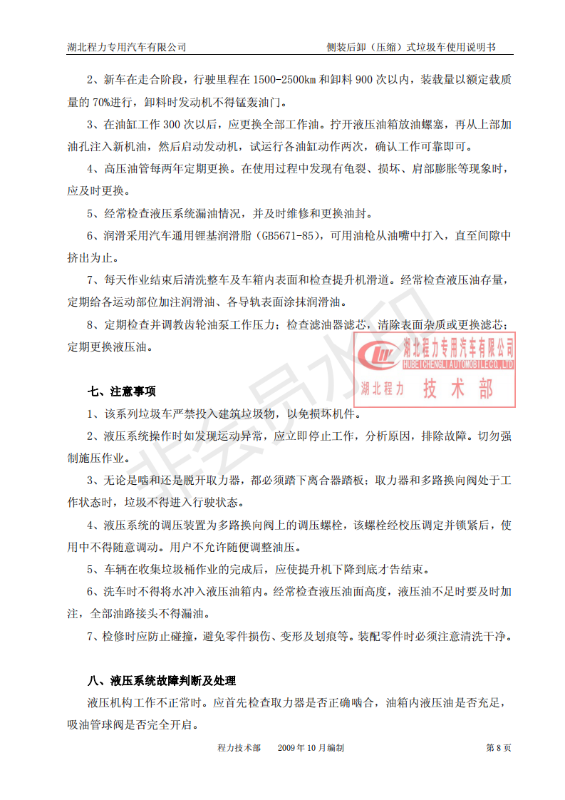 湖北程力掛桶垃圾車又名自裝卸式垃圾車主要用于各環(huán)衛(wèi)市政及大型廠礦部門運(yùn)載各種垃圾,亦可運(yùn)輸灰、砂、石、土等散裝建筑材料,也可以在礦山或煤礦中運(yùn)送礦石或煤。由密封式垃圾廂、液壓系統(tǒng)、操作系統(tǒng)組成。舉升油制缸(2支)垃圾廂可自吊上放下,上下一次工作循環(huán)時間≤50S。另外還可以改裝壓縮功能。湖北程力側(cè)裝后卸(壓縮)式掛桶垃圾車使用說明書:![]() ![]() ![]() ![]() ![]() ![]() ![]() ![]() ![]() ![]() |
