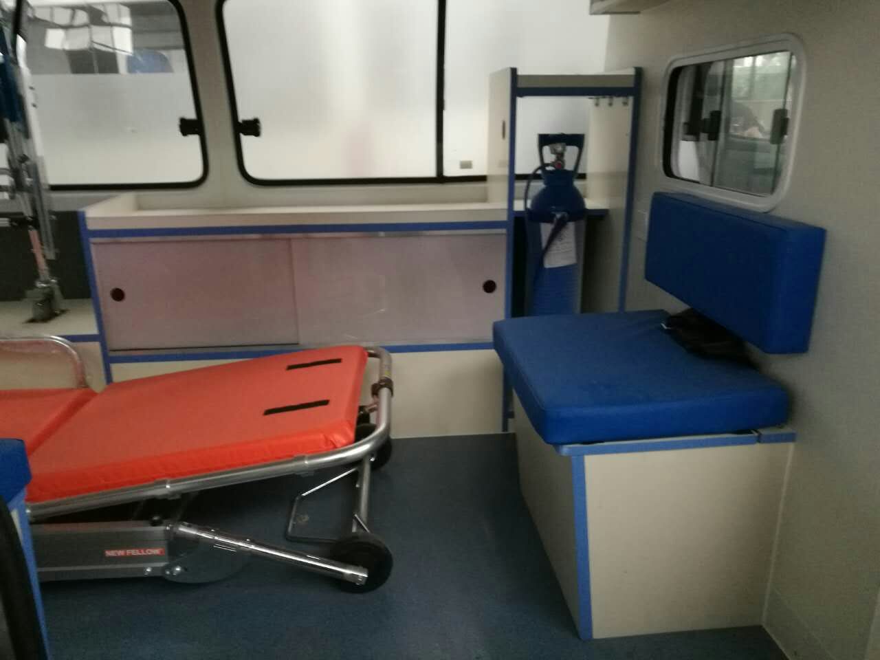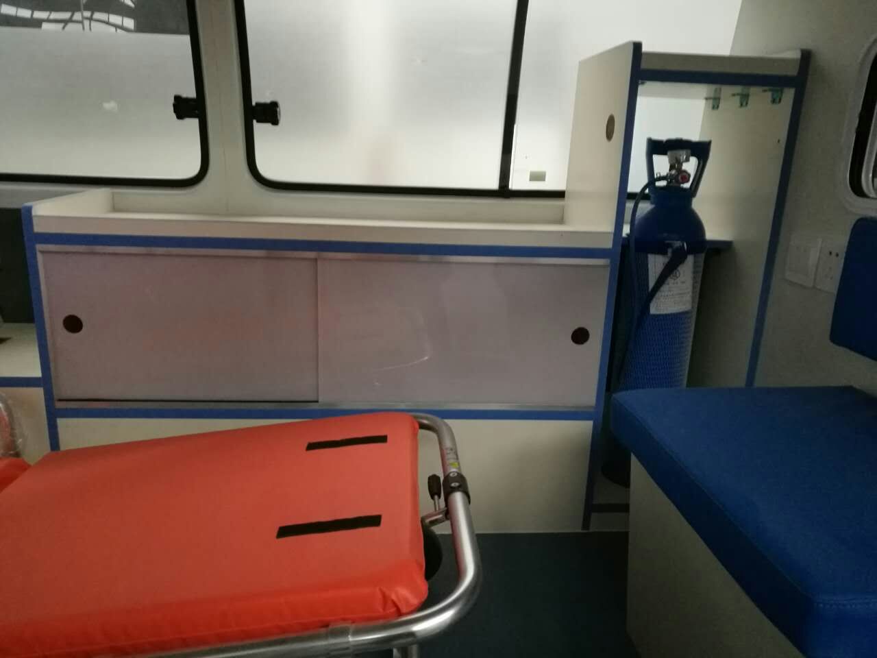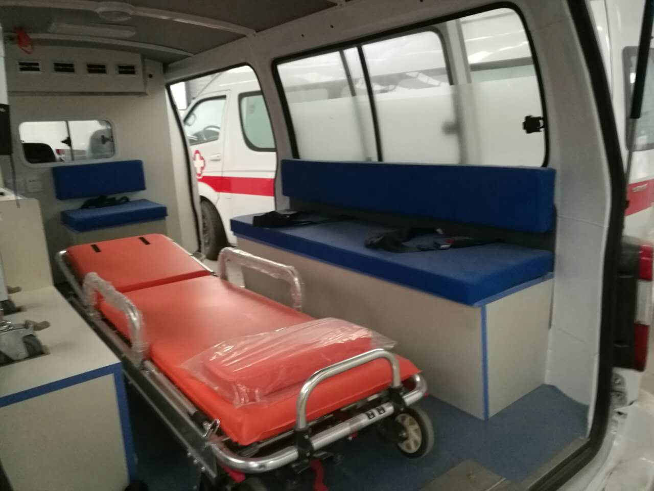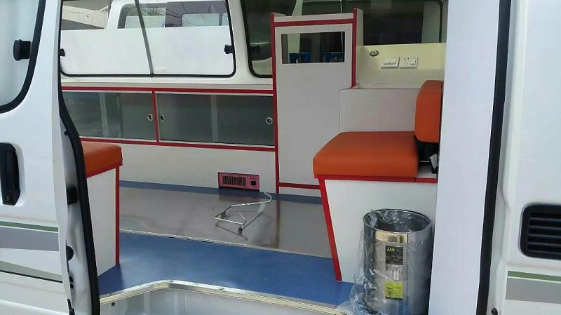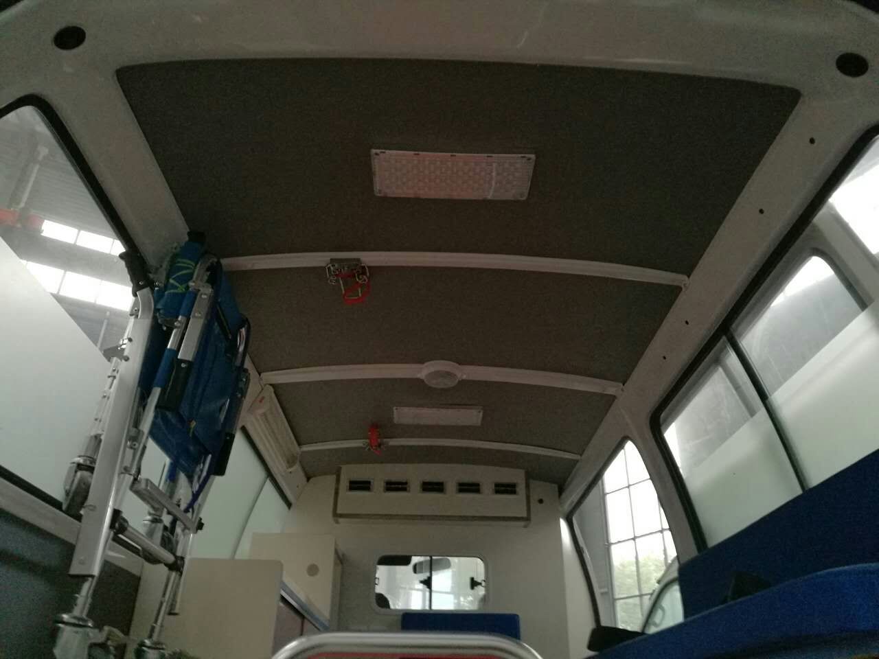 1、便攜折疊式擔架1件;2、醫藥柜1件;3、固定安裝氧氣瓶1只;4、輸液吊鉤2只;5、消毒燈1只;6、污物桶1只;7、單人座椅3只;8、長條貯藏柜帶2人位軟座墊、軟靠背和安全帶1套;9、中隔斷帶鋁合金滑窗1套;10、前頂裝全藍警燈警報器1套;11、照明燈2只;12、逆變器1只;13、電源插座1組;14、中門上車扶手;15、后門上車踏板;16、醫用耐磨塑膠地板革;17、貼救護十字標志;廠家銷售熱線:13872882215.