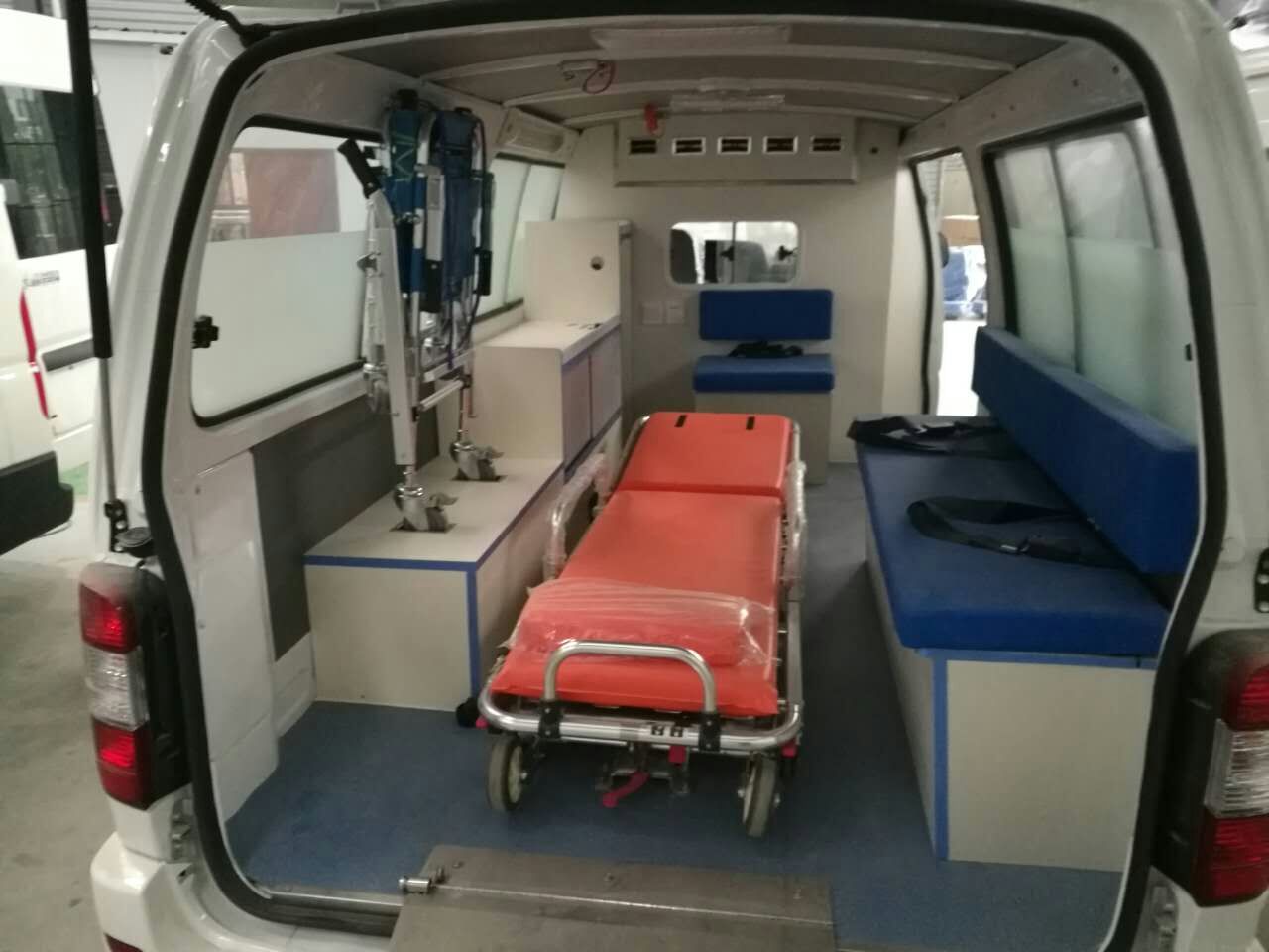 國5救護車(金杯轉運型救護車)SY5033XJH-D3S1BH(國五汽油機),功率:73.5kW,軸距:2590mm,輪胎型號:185R14,發動機型號:4G19,排量:2.0,帶前后空調,電動門窗,方向助力,后醫療艙配置(自動上車擔架,氧氣瓶5L,耐減,防滑,)