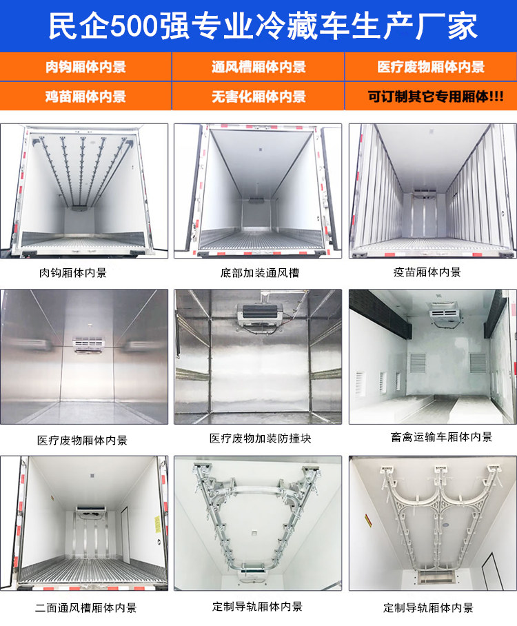 箱體采用三明治結(jié)構(gòu),內(nèi)外采用冷藏車專用玻璃鋼(可反射陽光可選用不銹鋼),中間保溫層采用聚氨酯發(fā)泡隔熱材料,18米罐注一次成型,產(chǎn)品重量輕,漏熱率(導(dǎo)熱系數(shù))低,強度高,保溫效果好,廂體美觀大方扎實耐用。廂體厚度8CM.廂體全為不銹鋼鎖件,鋁合金包角,廂體可選裝通風槽、開側(cè)門等。根據(jù)需要可選裝配國內(nèi)外知名制冷機組(溫度達到保鮮或冷凍要求),可根據(jù)您的需求進行定制生產(chǎn)。