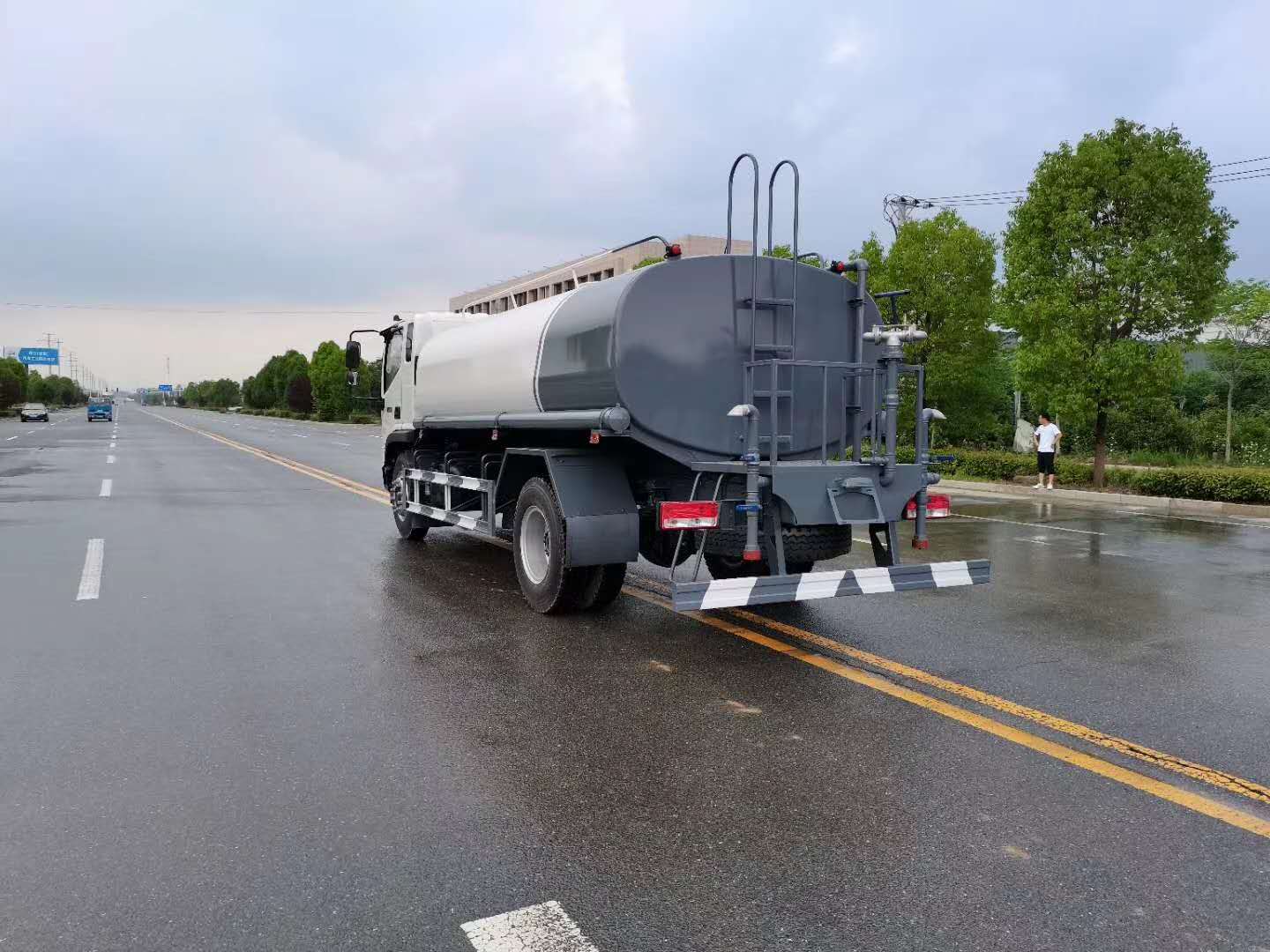 備注:1、該車僅選用4500mm軸距改裝,罐體有效容積為10.06立方米。2、罐體外形尺寸(長×長軸×短軸)為(mm):4500×2300×1410。3、防護材料:Q235B碳鋼,連接方式:左右側面防護與后下部防護采用焊接連接,后部防護斷面尺寸(mm):150×60,后部防護離地高度(mm):460。4、ABS系統生產廠家:廣州瑞立科密汽車電子股份有限公司,型號:CM4XL-4S/4M。5、專用裝置:罐體,主要用于路面灑水及園林綠化。